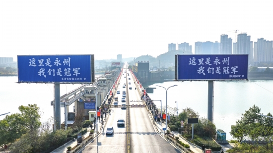 近日,永州市宋家洲大桥桥头的广告牌,成了江苏各市网友庆祝永州队湘超夺冠的“实力展示牌”。
