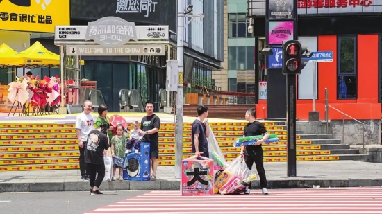 走在长沙解放西路的街头,有不少满面笑容、扛着“巨型包裹”的“显眼包”——有人怀抱半人高的超级奥利奥,还有人身披“被子”一般的双仔辣片……这些与众不同的“玩意”,都来自这条街上同一处“巨人国”。