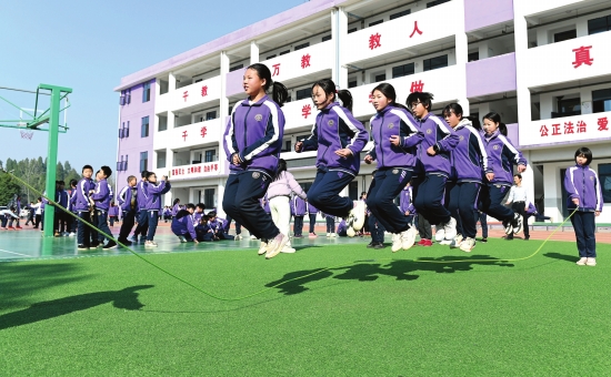 1月9日,邵阳洞口县黄桥镇九峰完全小学,学生在大课间跳绳。近年来,洞口县中小学校积极打造“欢乐大课间”校园文化,引导学生利用课间时间开展跳绳、球类、趣味游戏等文体活动,让孩子们在运动中愉悦身心、锻炼身体、增强体质。 图/视觉中国