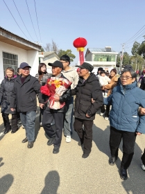 1月11日中午,李春喜与家人、20多位“宝贝回家”志愿者以及众多媒体朋友一同驱车抵达湘阴县樟树镇亲爱村。在村里的路上与老家门口,挂满了灯笼与横幅。村里不少居民纷纷走上街头,迎接李春喜回家。在人群中,两位老人翘首以盼,正是李春喜的哥哥涂发时、涂德明。