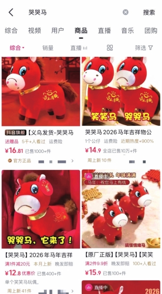 潇湘晨报记者搜索发现,在各大电商平台,出现了多家售卖“哭哭马”的商家与账号,相关商品更是层出不穷,有很多商品也标上了“义乌发货”、“原厂正版”等标签。
