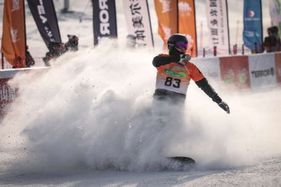 1月16日,中国选手高大礼在男子资格赛中。当日,2025—2026赛季国际雪联单板滑雪障碍追逐世界杯东北亚站在辽宁沈阳开赛。 图/新华社