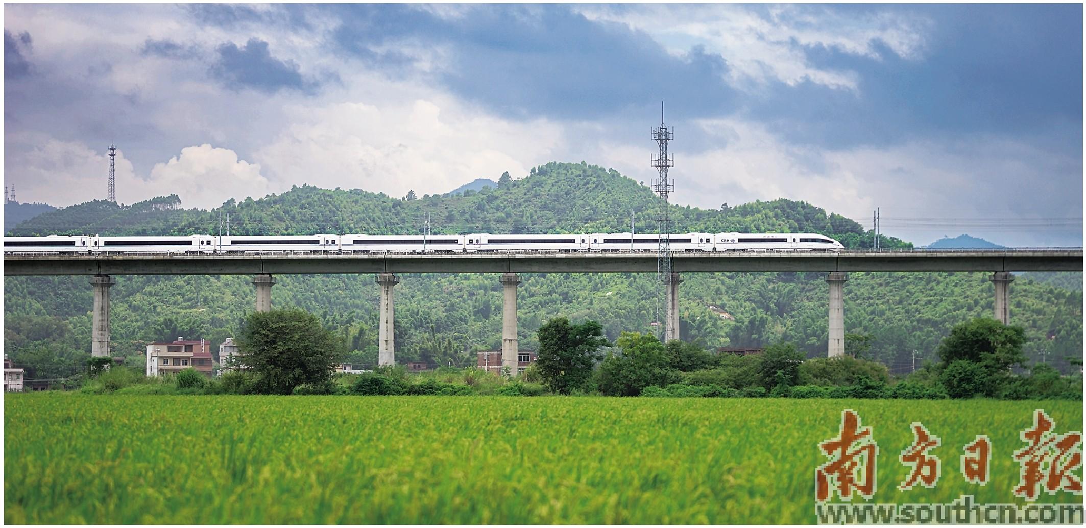 高铁从农发行广东省分行支持的东源县丝苗香米生产基地上穿梭而过。农发行广东省分行供图