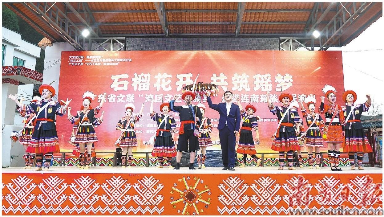 伴随着夜幕降临,“石榴花开 共筑瑶梦”——广东省文联“湾区文艺轻骑兵”走进连南瑶族惠民演出在牛路水村文化广场火热举行,民族舞蹈、歌曲《水路田》、街舞、歌曲《瑶山美》、魔术表演、合唱《相亲相爱一家人》等精彩节目轮番上演,既展现形式多样的艺术,又体现连南地方民族文化特色。观众们体验瑶族长桌宴边看演出,文艺志愿者们走进观众中间热情互动,现场气氛浓厚热烈,掌声、喝彩声、叫好声不断。