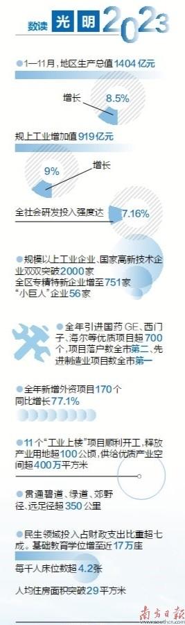 刚刚过去的2023年,是光明赶超奔跑、追求卓越的一年。经济社会文化各项事业迈上新的台阶。1—11月,地区生产总值1404亿元,增长8.5%;规上工业增加值919亿元,增长9%;固定资产投资完成942亿元,增长13.7%。