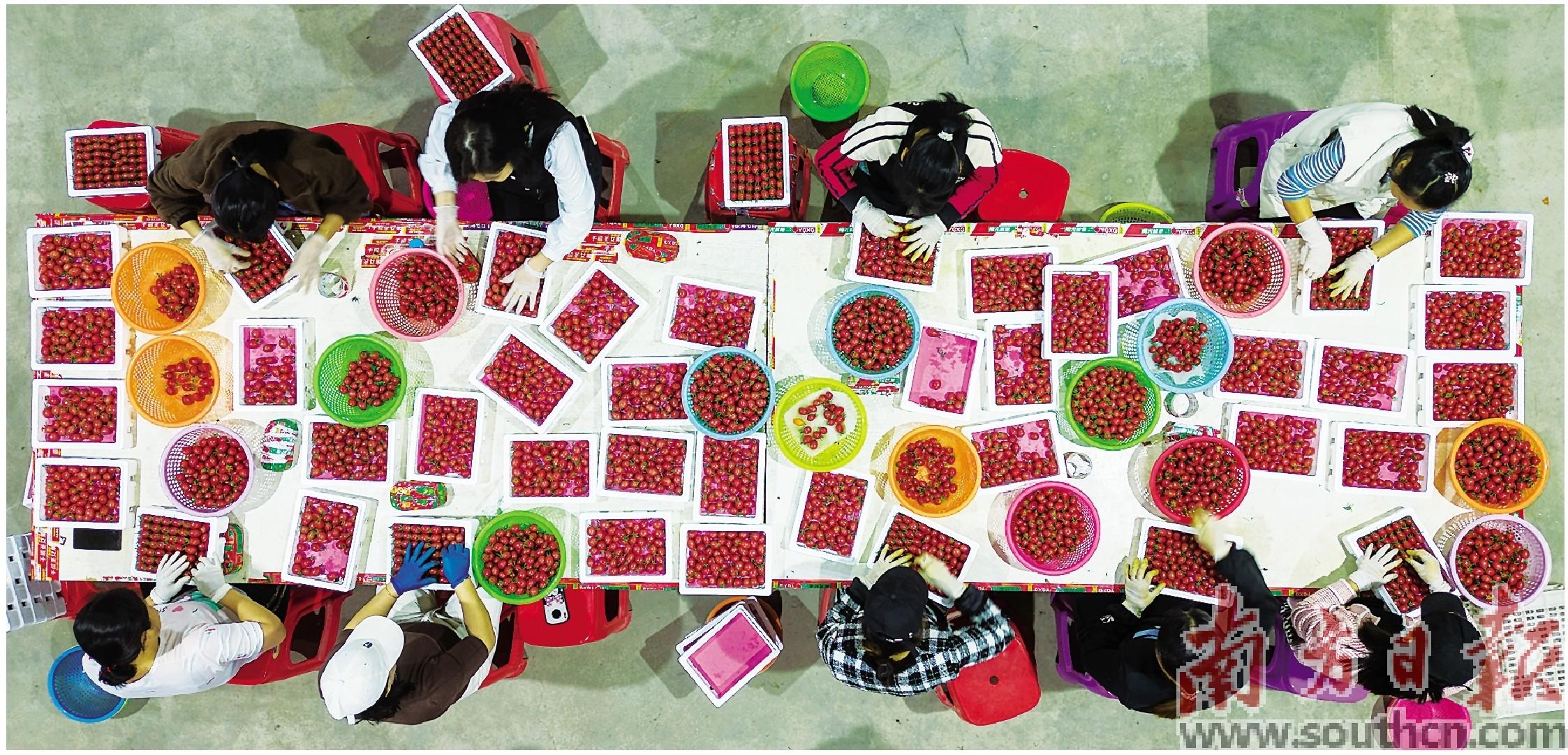 工人们正对圣女果进行分拣、包装。满桌堆放的红色特别亮眼。