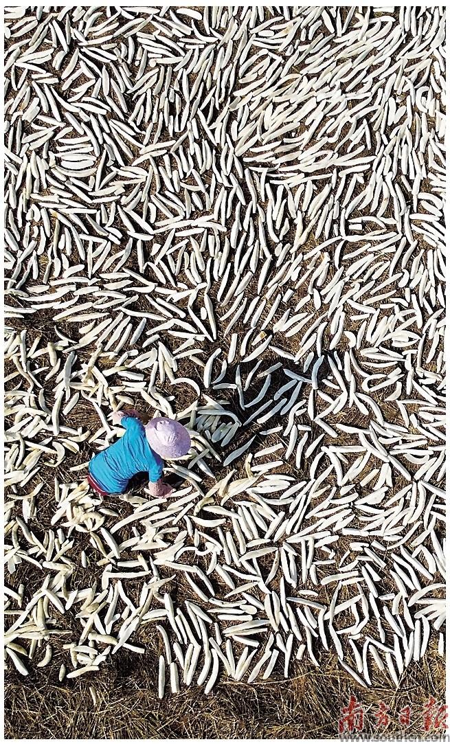 沙琅镇谭儒村的丰收色是白色。电白区沙琅镇谭儒萝卜种植基地因种植萝卜的位置原是旧河床,沙滩洁净远离污染,土地含沙量高,透气湿润再加上临近沙琅江,能长期使用清纯的河水浇灌,使这里出产的萝卜汁多味甘,清脆可口。谭儒村委会因地制宜,于2017年建成这近1000亩的萝卜种植基地,打造“一村一品”的同时将产品延伸到萝卜条、萝卜丝、萝卜片等,并引进著名食品加工企业茂德公食品集团,让萝卜产业走上快车道,成功带动谭儒村民增收致富。