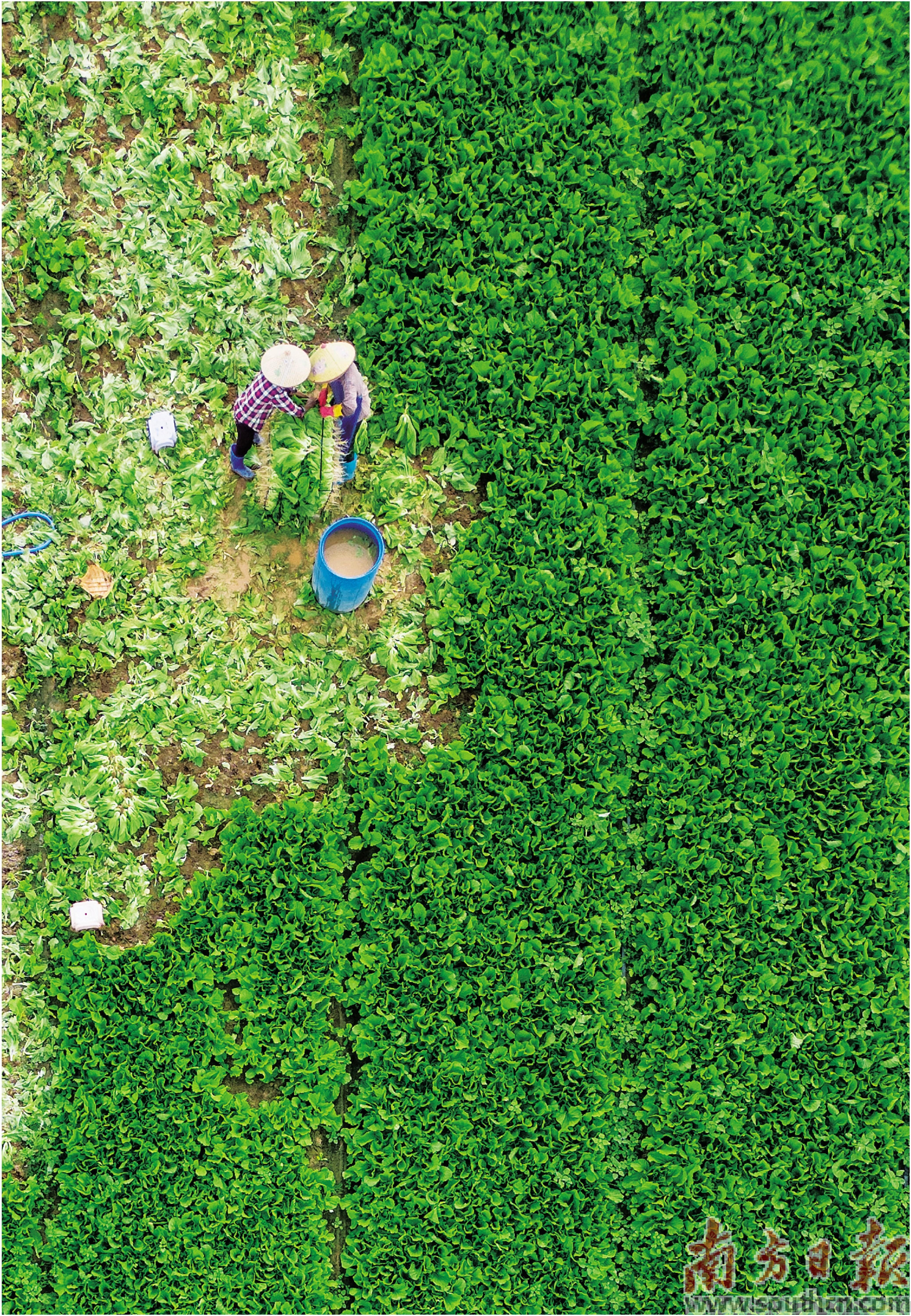 芥菜种植基地,成片绿色的芥菜映入眼帘,村民们正忙着采收。