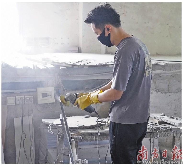 近日,陆丰市诚信石业有限公司的石雕车间,两名石雕工人在操作机械,对石材原始方料进行打磨雕刻,整个生产过程噪声很小。同时,在机械运作时,雕刻抛磨产生的石粉,经由专门的设备进行回收处理,并未飘浮到大气中。