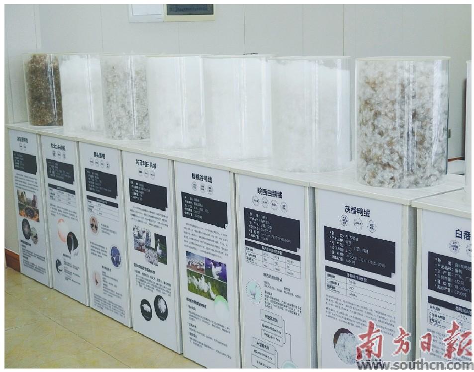 广东鸿基羽绒制品有限公司的展厅里,陈列着各种高品质羽绒。姚瑶 摄