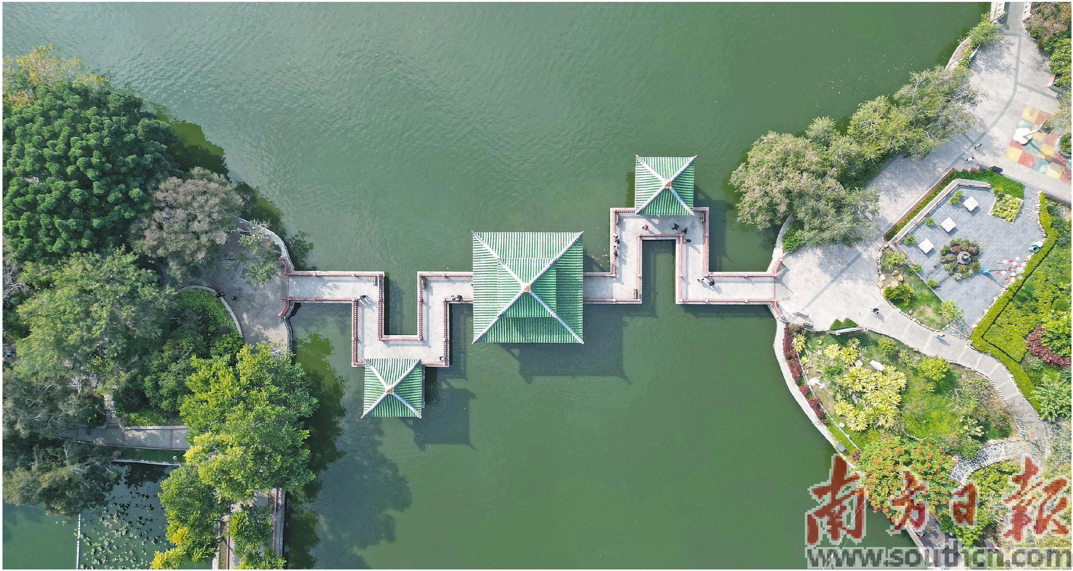 冬日照射下,九曲桥如彩带挥舞在名树古木和亭台建筑之间,洒脱也含蓄。
