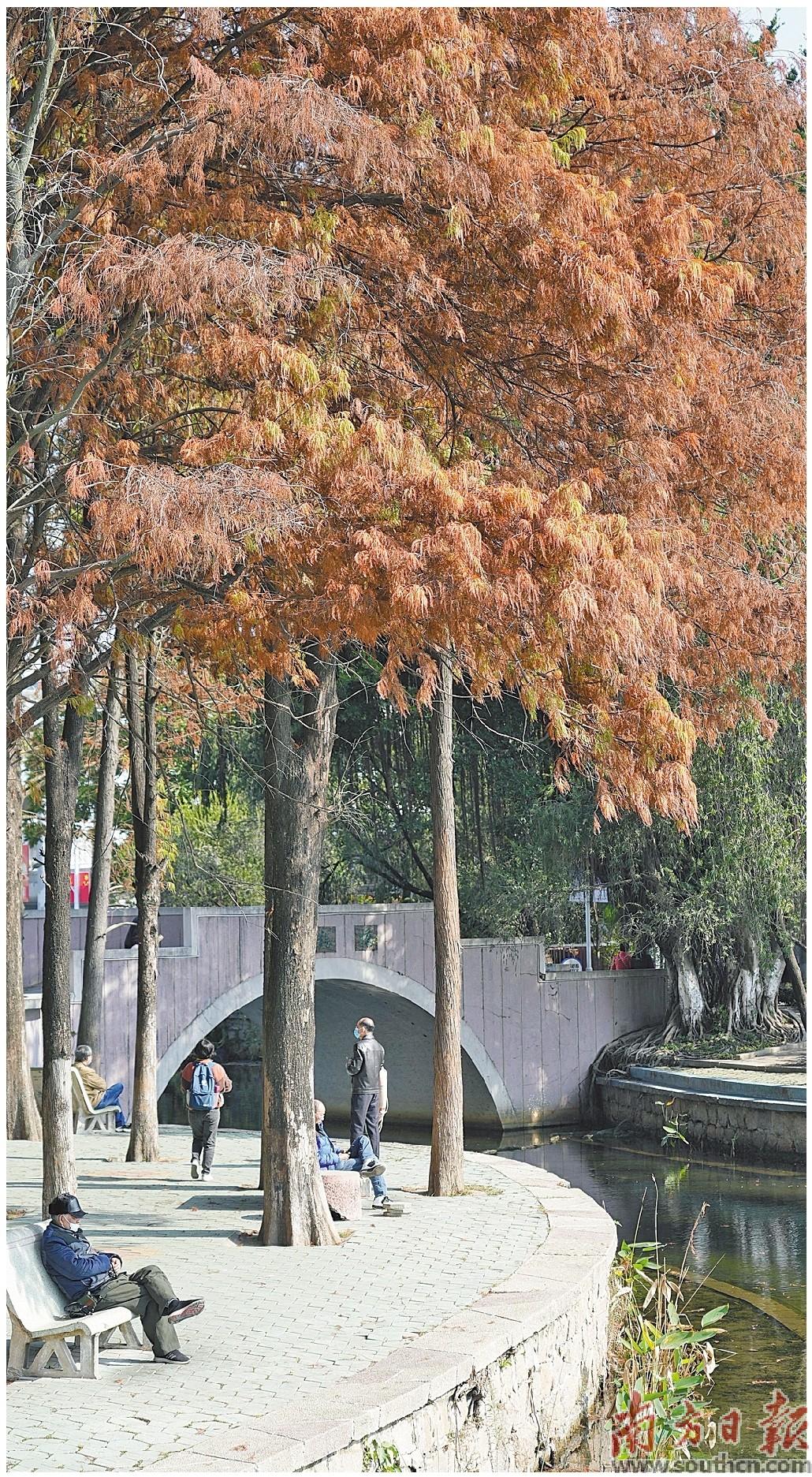 公园里健身休闲的老人与焦糖色的落羽杉树,共同构成了一幅温馨美好的画面。