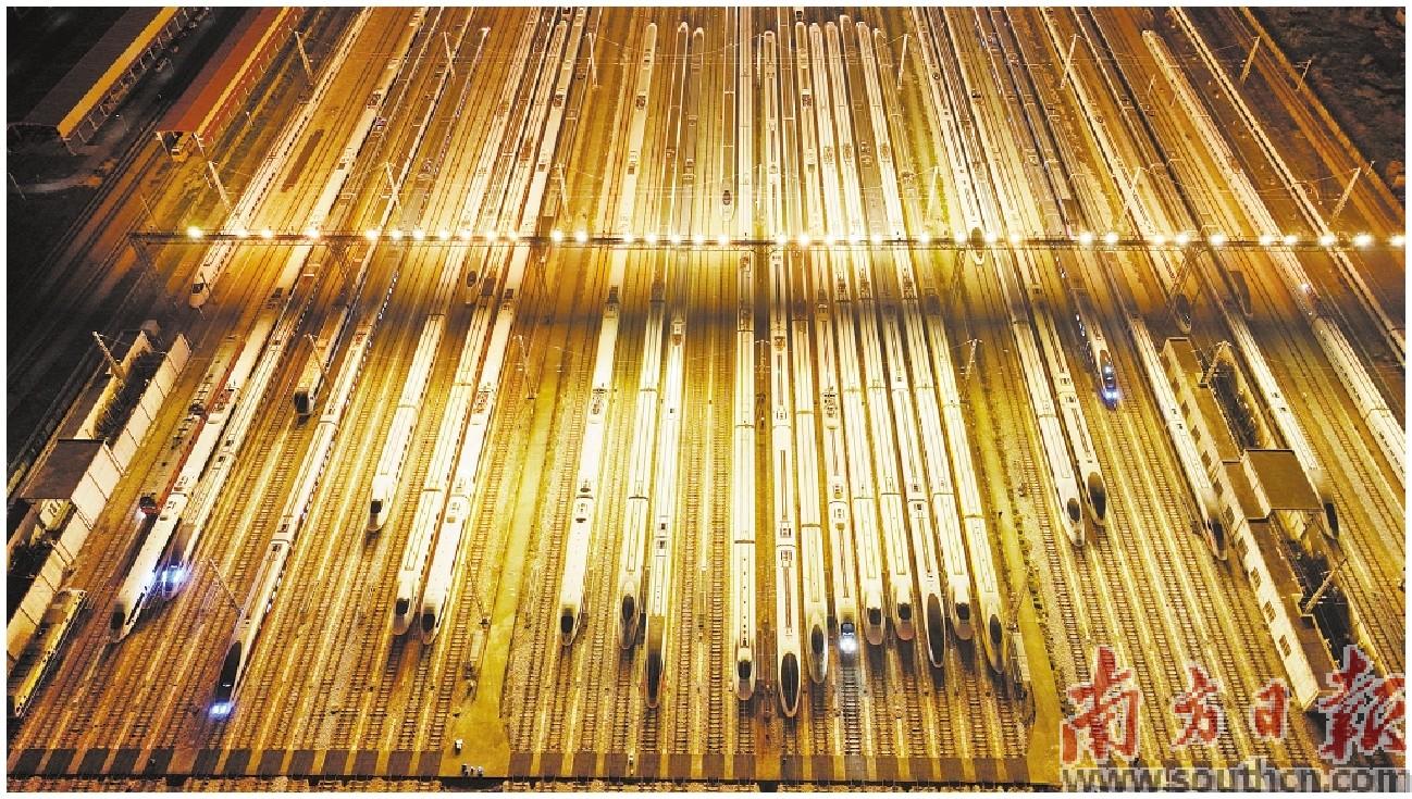 在广州南动车运用所,动车组如同一支“陆地舰队”,即将服务春运。蔡晓文 摄