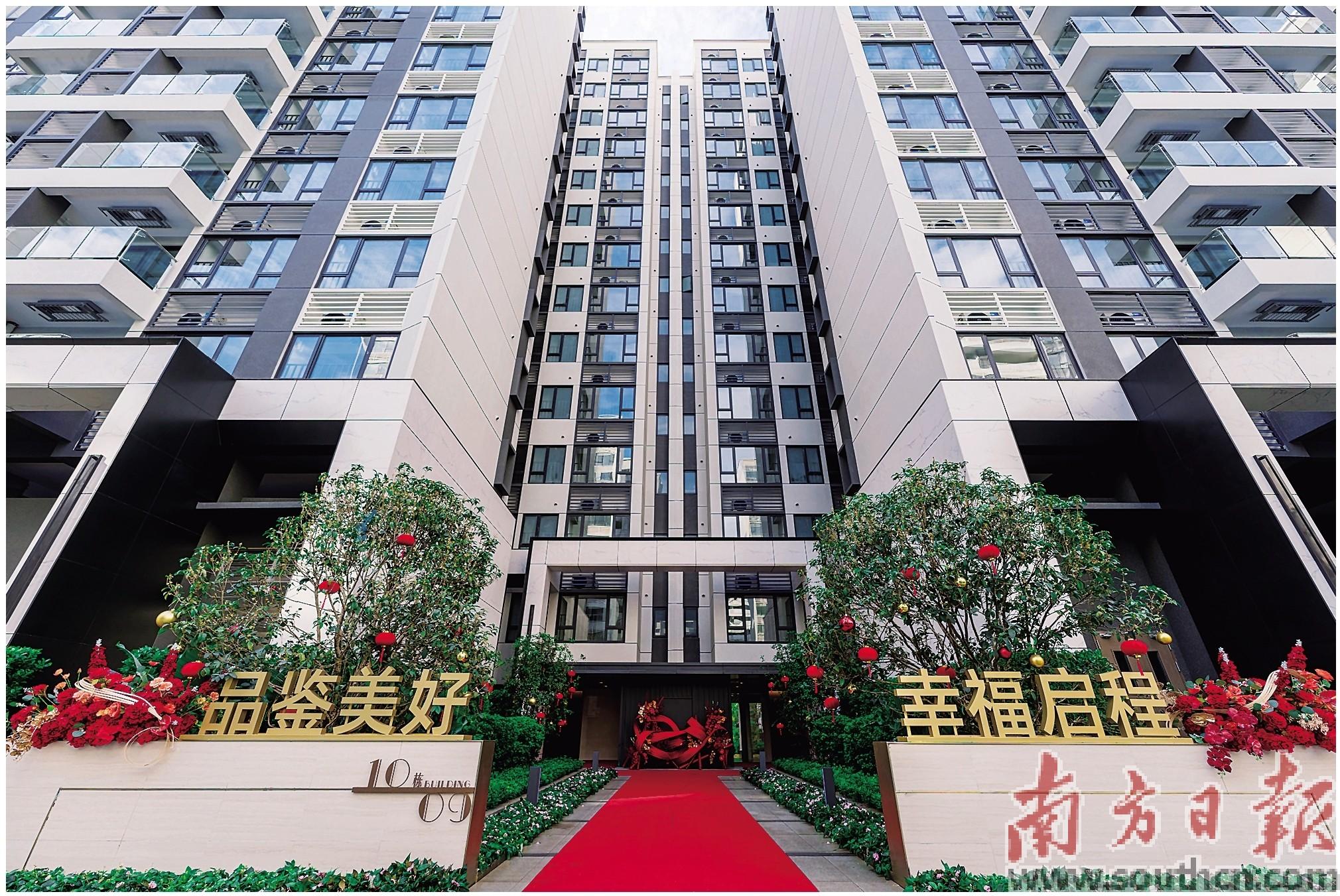 鲜花满上,灯笼挂上,红地毯铺上,“新年快乐”“欢迎回家”的大字在阳光下醒目耀眼……2023年底至2024年元旦,位于广州天河金融城北的城投珠江·天河壹品如张灯结彩般热闹。这里刚刚完成二期7一12栋的集中交付,业主成功拿到了新房的钥匙。值得注意的是,此次交付时间比原定计划提前了整整一年。