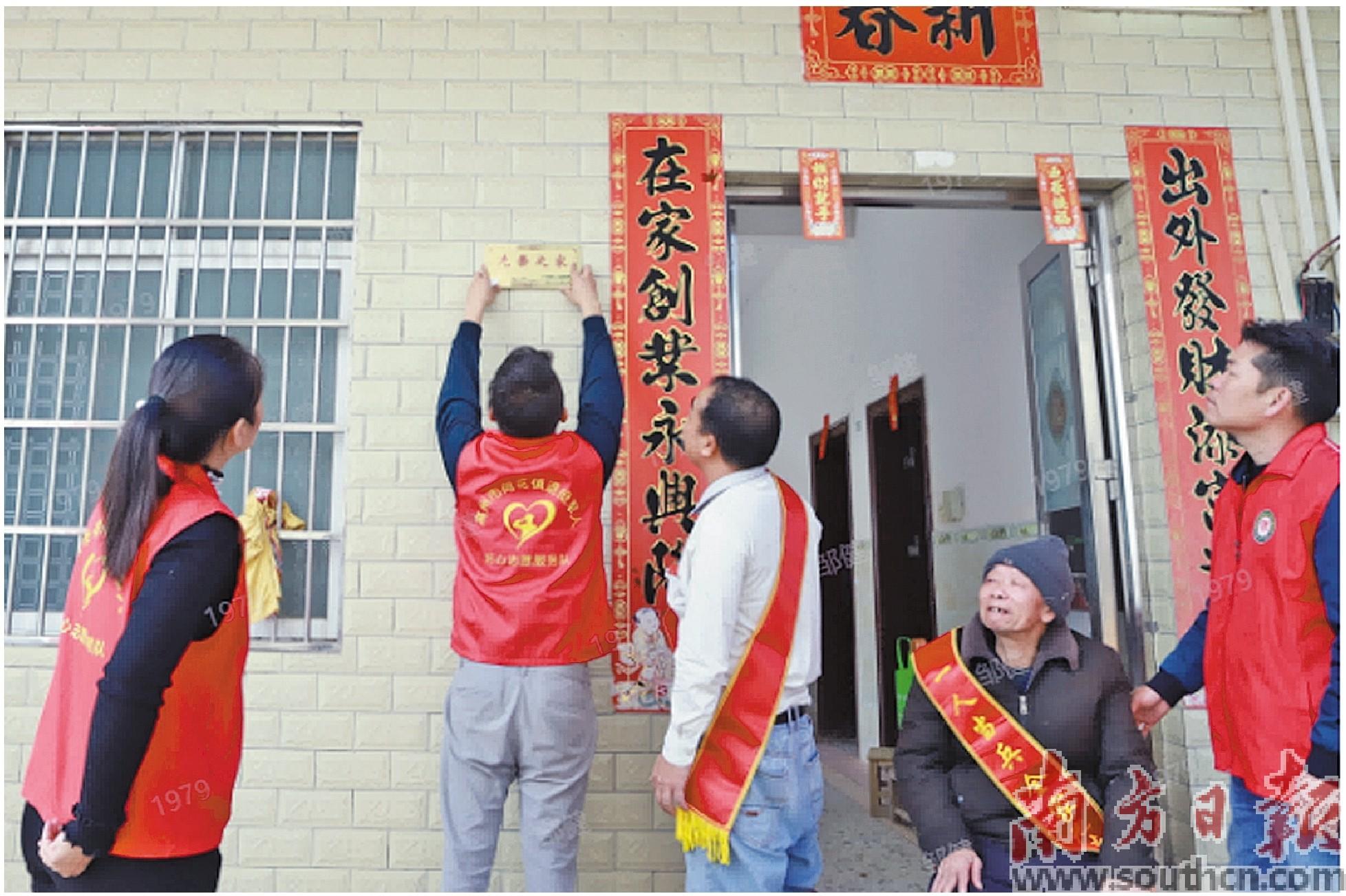 工作人员为光荣之家挂牌。邹健 摄