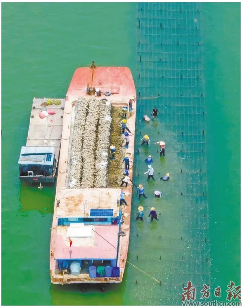 工人将收获的程村蚝转运上船。
