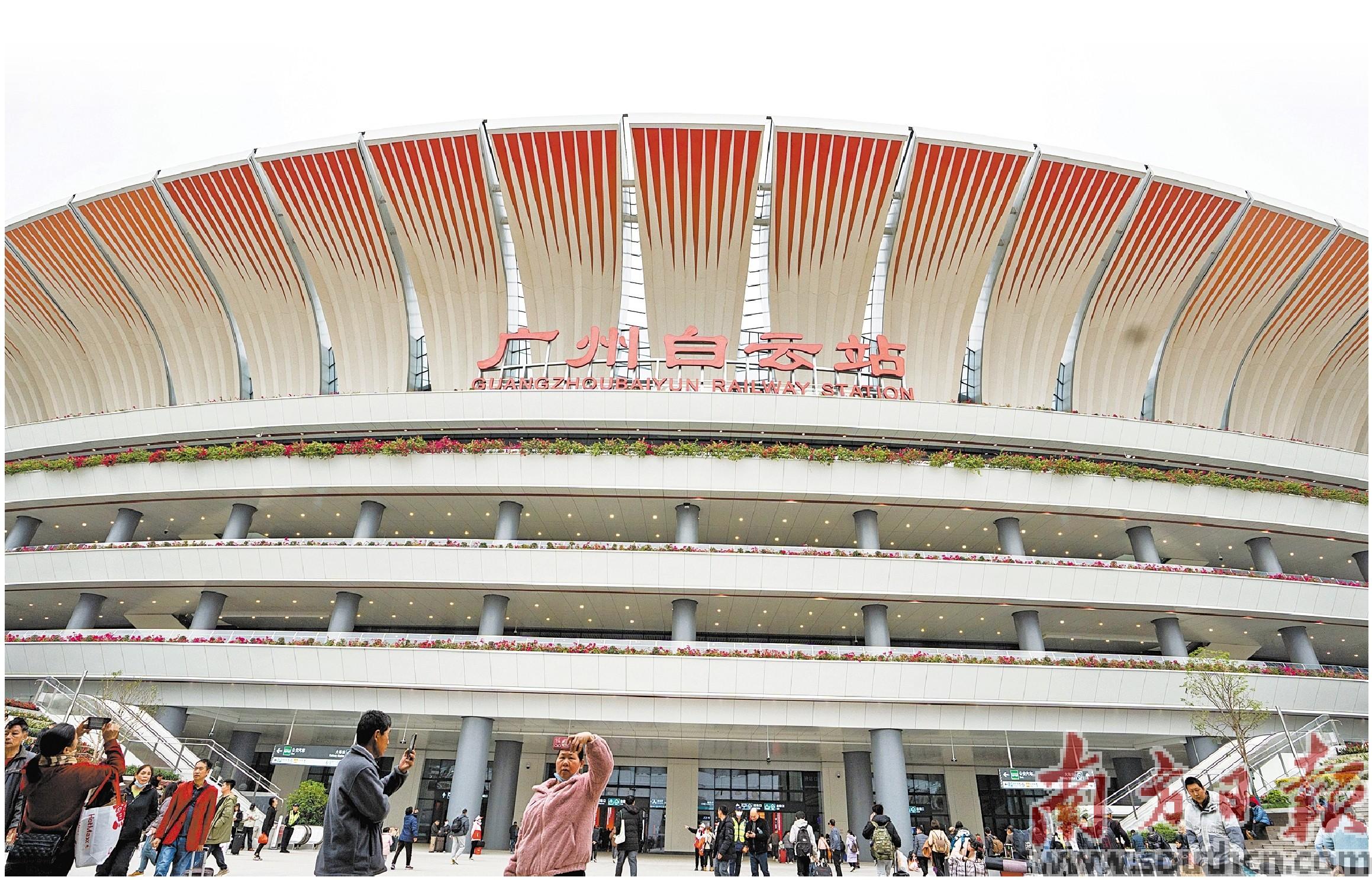 旅客到新开通的广州白云站乘车回家过年,被建筑造型所吸引,纷纷拍照留念。南方日报记者 张令 摄