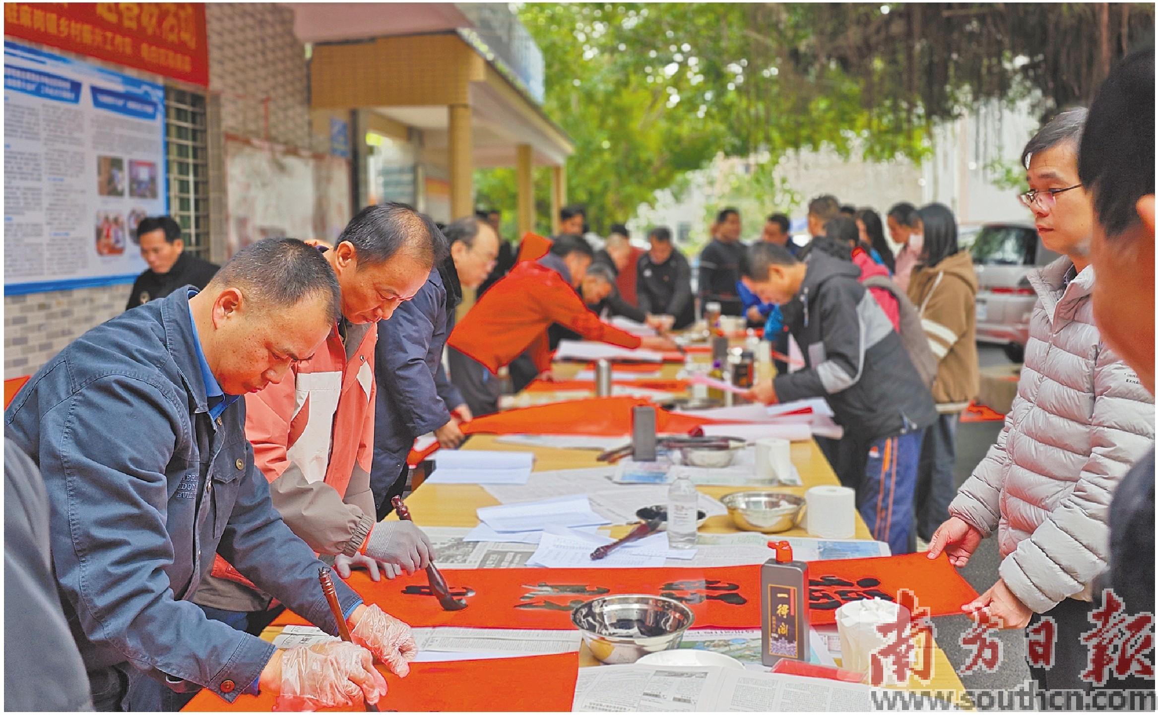 一起一落、一停一顿,一幅幅风格独特、寓意吉祥的“福”字和春联便跃然纸上。春节临近,一场场年味十足的写春联、送福字、迎新春活动在电白各乡镇开展。1月26日,广东省税务局驻麻岗镇帮镇扶村工作队在麻岗镇坑内村组织开展“辰龙送瑞 春联传福”送春联活动,邀请书法爱好者现场为村民写春联、送祝福。“神州春暖山河秀,华夏龙腾日月新”“年年顺景财源广,岁岁平安福寿多”……书法爱好者挥毫泼墨,把暖暖祝福融入字里行间。“手写的春联更有‘年味’,感觉过年的氛围越来越浓了。”活动一共送出约180副春联和330个“福”字,接过春联的街坊们,脸上露出满意的笑容,连声称好。