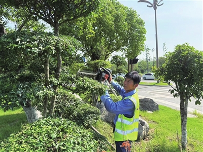 园林修剪看似简单,实则是门讲究耐心与技巧的手艺活。“单是常见的造型植物就有十多种,每种都有专属的修剪标准。” 晏凤桃如数家珍地说,“现在剪的小叶女贞,顶部要修成蘑菇状,中间得剪出树叶的轮廓,根部则要清爽利落。” 这份工作对体力也有要求,最重的手持机器有十五斤左右,工作时产生的强烈振动常让新手难以驾驭。“刚入行那阵,连续修剪了四五天,整条胳膊都抬不起来。” 回忆起初学花木修剪时的情景,他笑着说,“这时只能跟领导申请去浇水,让胳膊歇一歇。” 最考验技术的当属高空作业,遇上三四米高的行道树,得架着梯子修剪。“既要剪出规整的造型,又要顾及脚下的安全,尤其刮风天,站在梯子上既要稳住身子,又要控好机器,稍不留神就可能出岔子。”晏凤桃介绍。