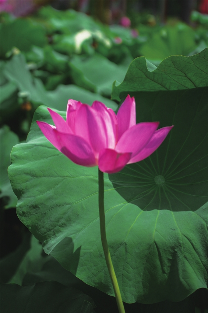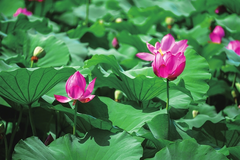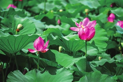 粉色荷花从叶间探出头,有的含苞待放,像羞涩少女红了脸颊;有的肆意盛放,展露蓬勃生命力。