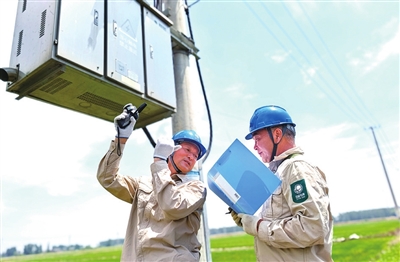 连日来,针对高温天气,市供电公司组织人员开展设备巡视和红外测温工作,以保障设备安全可靠供电。图为甘垛供电所员工对振兴村5号配电变压器进行红外线测温。
