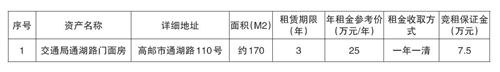 经有关部门批准,高邮市交通运输局定于2025年7月29日下午3:30在扬州市公共资源交易中心高邮分中心网站对以下房产进行网上公开招租:(见附件)具体招租细节及要求请参见招租单位招租公告(公告发布网址:http://ggzyjyzx.yangzhou.gov.cn/gyfzx/ 产权交易)。