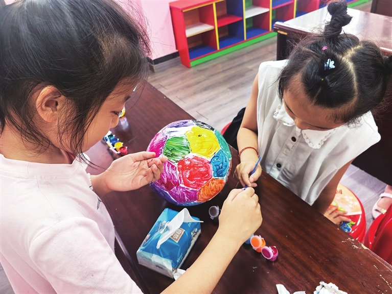 近日,一场别开生面的“手绘足球”活动在送桥镇儿童之家温情上演。活动现场,孩子们围坐在一起,互相交流着想法,各自完成属于自己的足球画作。图为活动现场。