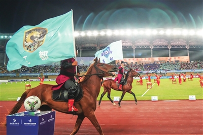 当晚7时整,鼓声响起,驿马奔腾。《驿丞传捷》节目中,一匹驿马率先现身,骑手高举“扬超”赛旗迎风驰骋,绕场一周;紧随其后的九匹驿马,载着扬州9个县(市、区)、功能区的队徽亮相,向全场观众致意,瞬间引爆了全场。