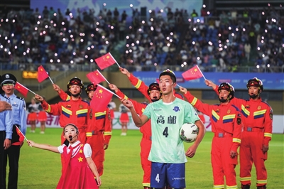 中场休息时,《我和我的祖国》的旋律响起,教师、公安、医生、环卫、消防等6组代表登场。歌声飘扬在球场的每一个角落,让中场的间隙化作一场关于热爱与团结的盛宴。“从未在家门口看到这么高规格的足球比赛,现场的硬件和氛围都特别棒。”市第一中学的体育特长生杨达难掩激动。