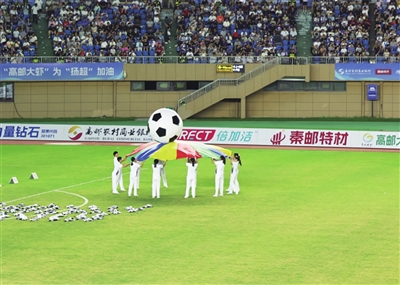 随后,最具青春朝气的足球少年团体操登场。来自市第二中学和市外国语学校这两所国家级校园足球特色学校的近500名学生,身着统一白色服装进场。他们挥动手中的足球伞,阵型随着音乐不断变换,组成“大运扬州”“你好高邮”的字样。表演中,学生们用手中的彩色道具组成红蓝配色的足球运动员形象,在场上运球进球。最后,足球少年们手中的道具又组合成五星红旗,闪耀在球场之上。“表演太精彩了,哥哥姐姐们真棒。”看台上,来自市实验小学东校区的贾轩扬激动地说道。