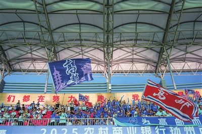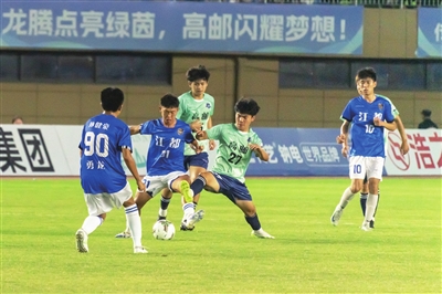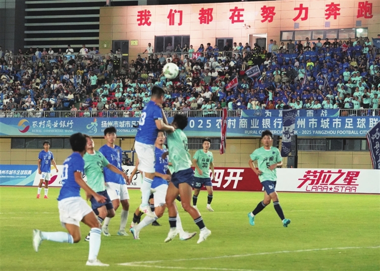 绿茵场上,哨声响起。双方运动员你追我赶,展开鏖战。助跑、摆腿、击球…… 一系列动作行云流水,足球在运动员脚下划出一道道灵动的弧线,现场欢呼声、呐喊声此起彼伏。“高邮,战斗;高邮,加油!”高邮队球迷方阵中,500名球迷高举应援横幅,擂鼓助威,口号声一波又一波席卷球场。每当运动员带球冲锋,双方球迷们更是站起身来挥动队徽,旗面在夜风中猎猎作响,空气中弥漫着人们对运动的热爱、对拼搏的致敬。
