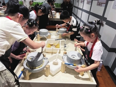 在高邮镇龙伟有限公司,孩子们围上小围裙,化身“小小豆浆师”。志愿者演示石磨研磨技巧,“慢工出细活”的古法智慧引得阵阵惊叹。小手推动磨盘,黄豆化作乳白浆汁,蒸腾的热气里飘散着千年技艺的醇厚。更有孩子发现秘诀:“逆时针磨浆更顺滑!”最后品尝自制豆浆时,骄傲写在每一张沾着豆沫的小脸上。