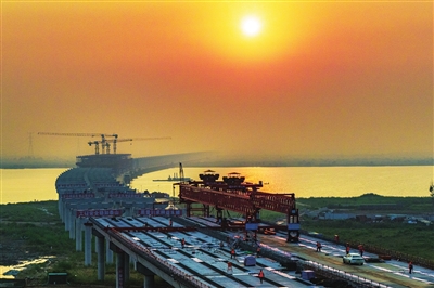 连日来,宁盐高速高邮湖西互通主线桥建设现场一片繁忙,施工人员避开高温时段集中力量施工,为项目早日通行抢抓工期。图为作业现场。