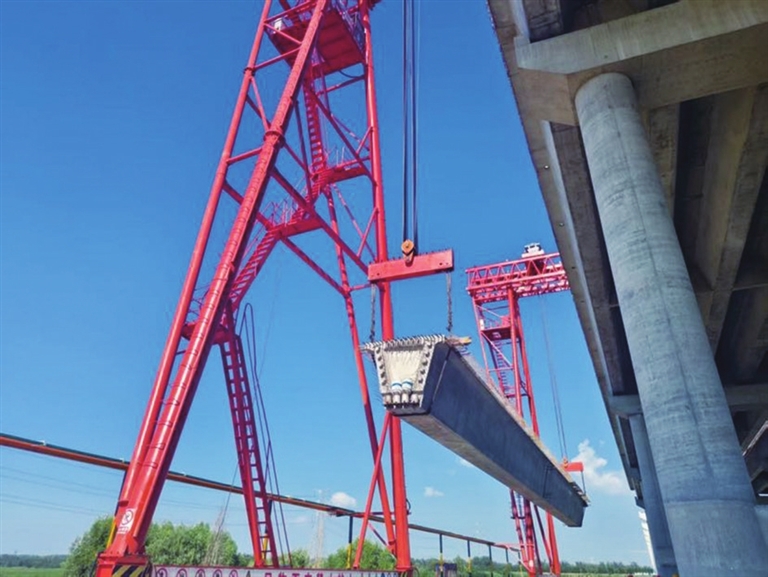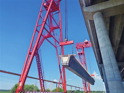 近日,宁盐高速扬州段传来最新消息——高邮湖特大桥提梁站正式投用。高邮湖特大桥提梁站位于庄台河东侧、大桥159号至163号墩之间,采用跨墩龙门吊方案,配置两台110吨高低腿移动式门吊,以确保40米、35米、33.5米箱梁的提梁能够顺利上桥,再由运梁车转运至架桥机,最终实现精准安装。图为项目现场。