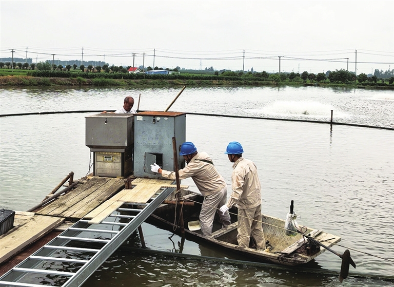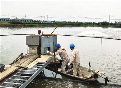 近日,我市出现阴雨低气压天气,水产养殖户纷纷启用增氧、投料设备。市供电公司组织工作人员到塘口走访服务,保障可靠用电。图为甘垛供电所员工在横铁村一黄颡鱼塘口维护电力投料机。