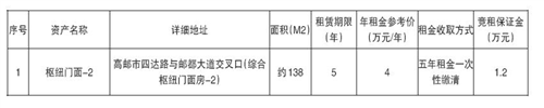 有意者请在2025年9月16日10时00分至2025年9月29日16时30分,在扬州市公共资源交易中心高邮分中心网站(http://ggzyjyzx.yangzhou.gov.cn/gyfzx/)交易响应方登入注册报名,缴纳保证金。(挂牌报名期满,如未征集到意向承租方,项目终结)。