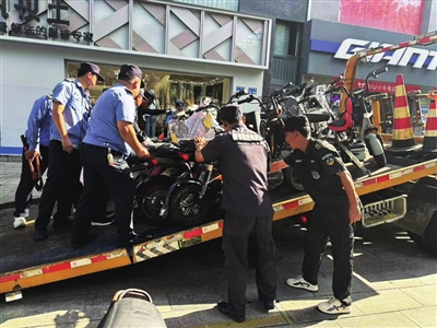 近日,市城管局联合交警部门开展非机动“僵尸车”集中清理整治行动,通过拉网式排查,依法对通湖路、佳禾路、国雄路等主次干道及商圈周边区域长期停放、占用公共空间的“僵尸车”进行统一拖移,集中规范存放,还路于民。图为整治现场。