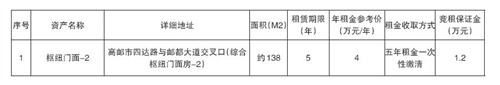有意者请在2025年9月16日10时00分至2025年9月29日16时30分,在扬州市公共资源交易中心高邮分中心网站(http://ggzyjyzx.yangzhou.gov.cn/gyfzx/)交易响应方登入注册报名,缴纳保证金。(挂牌报名期满,如未征集到意向承租方,项目终结)。