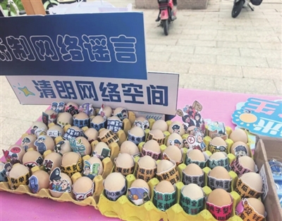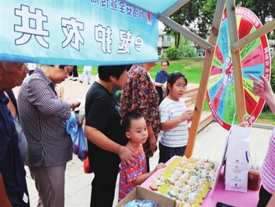 “网安有奖大转盘”游戏中,志愿者转动标有各种网络安全问题的大转盘,现场群众答对指针问题,即可以获得“网安蛋蛋”“龙虬好品”等作为奖励。