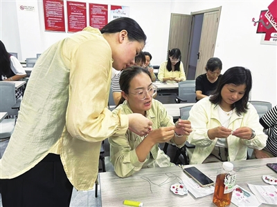 近日,城南新区总工会来到南苑社区,为20名失业人员、零就业家庭等就业困难群体开展手工挂坠制作技能培训活动。专业讲师采用“理论讲解+实操示范”的教学模式,从手工挂坠的设计思路、基础工具使用等入门知识讲起,并为学员演示串珠色彩搭配、绳结编织技巧、造型固定方法等核心步骤。图为活动现场。