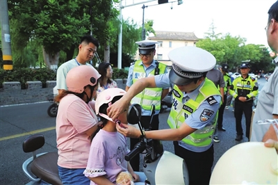 24日,市公安局交管大队宣教人员会同市文明办、高邮实验小学西校区,在东奎楼路口开展“头盔免费送 安全‘戴’上头”校园周边交通秩序整治行动,切实增强学生交通安全意识,筑牢校园出行安全防线。图为交警向学生赠送头盔。