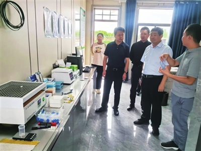 在扬州东寅水产品批发市场,张贵龙一行实地观摩了淡水鱼质量安全检测工作,详细了解检测流程、样本选择、试剂配比及检测后的废料处置情况,并围绕水产品产业发展、质量安全监管、市场规范化运营管理等方面进行了现场交流。