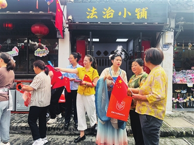 国庆假期,我市南门大街游人如织,一处由市司法局打造的“法治小铺”格外引人注目,“店小二”们大声吆喝,向过往游客普及法律知识,为节日增添了别样的法治温度。