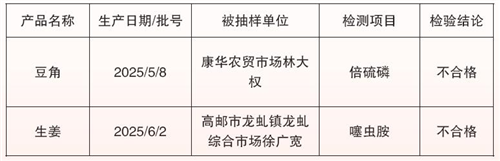 本期检测的食品(食用农产品)中,阳性20批次,阳性率0.057%。其中,二氧化硫阳性11批次,主要是虾米和生姜等,阳性率0.031%;农药残留阳性4批次,主要是油麦菜和豇豆等,阳性率0.011%;硫酸铝钾阳性3批次,主要是凉粉丝和凉皮卷等,阳性率0.009%;亚硝酸盐阳性1批次,主要是熟牛肉,阳性率0.003%;恩诺沙星阳性1批次,主要是鲫鱼,阳性率0.003%。对于抽检中发现的上述阳性食品(食用农产品),我局均已及时通知经营者下架销毁,或转为监督性抽检。