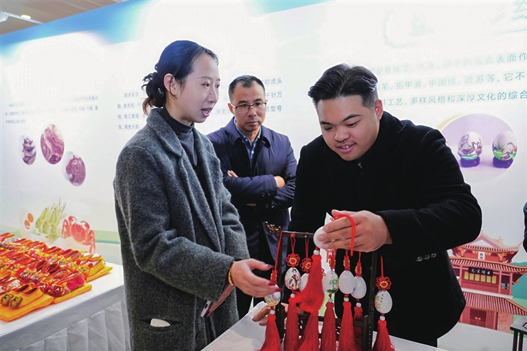“真厉害!”蛋雕大师李峥嵘的展台前挤满了人。小小蛋壳上雕出大千世界,精湛技艺引得众人惊叹。现场还有根雕、烙画、老虎鞋、蛋壳彩绘等非遗项目,一件件小巧精致的手工艺品,将高邮传统非遗文化鲜活地呈现在北京市民眼前。