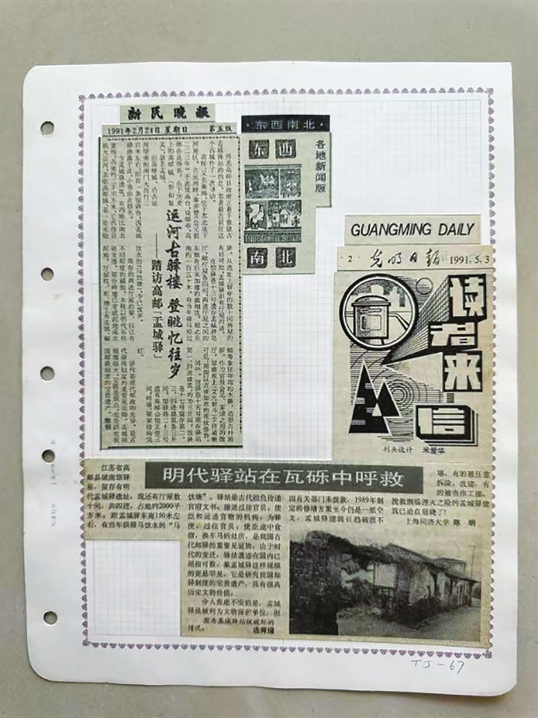 1991年,获悉高邮撤县建市,进入了发展的新阶段,我又通过中央级媒体的《光明日报》(1991年5月3日)刊发《明代驿站在瓦砾中呼救》向社会各界发出呼吁:“驿站是我国古代邮驿的重要见证物,江苏省高邮县留存有明代盂城驿遗址,现还有厅屋数十间,共四进,占地近2000平方米,距盂城驿东南150米左右,有当年供驿马饮水的‘马饮塘’,由于时代的变迁,驿站遗迹在国内已屈指可数,盂城驿这样规模的更是罕见,它是研究我国邮驿制度的宝贵遗产,具有很高历史文物价值……挽救濒临湮灭之险的盂城驿已迫在眉睫了!”还在《新民晚报》(1991年2月24日)刊发《运河古驿楼 登眺忆往岁——踏访高邮“盂城驿“》,以进一步提升社会各界对于盂城驿的关注度,为盂城驿的修缮而坚持不懈地努力,凸显青年大学生富有活力和初生牛犊不怕虎的劲头。