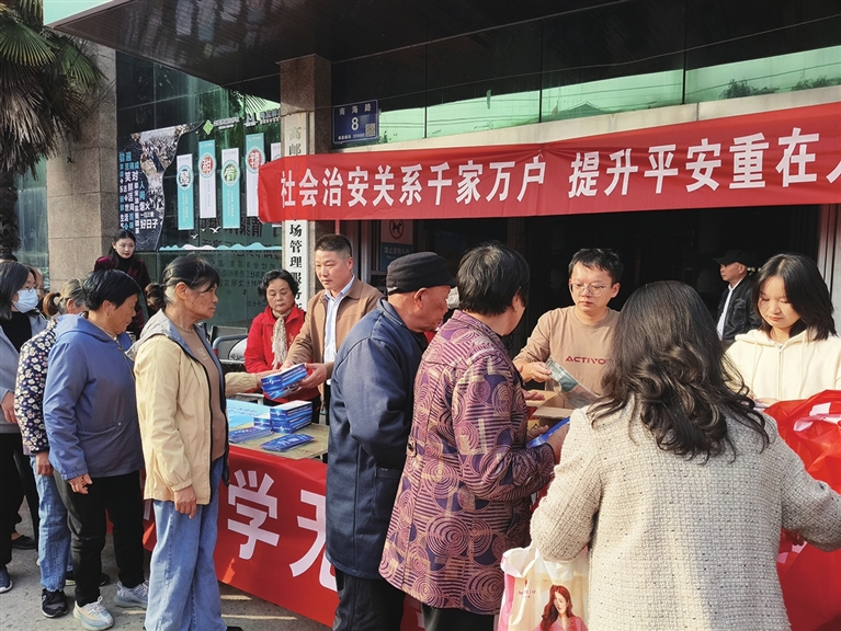 连日来,高邮司法所联合高邮镇社会治理办,以“高邮平安人人有责,平安高邮人人共享”为主题,共同开展系列宣传活动,深入推进平安高邮、法治高邮建设,营造全民参与的浓厚氛围。活动现场,工作人员通过折页、案例,向居民讲解反诈技巧与法律知识,重点剖析诱导老年人买保健品骗局等。图为活动现场。