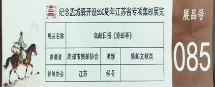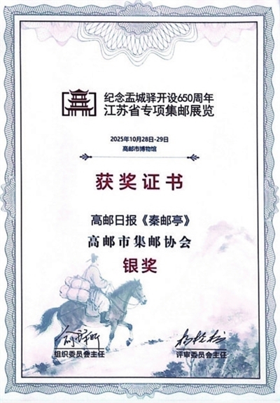 2025年10月28日至29日,“纪念盂城驿开设650周年江苏省专项邮展”在高邮市博物馆举办,高邮市融媒体中心与高邮市集邮协会主办的高邮日报《秦邮亭》专版获集邮文献类银奖。