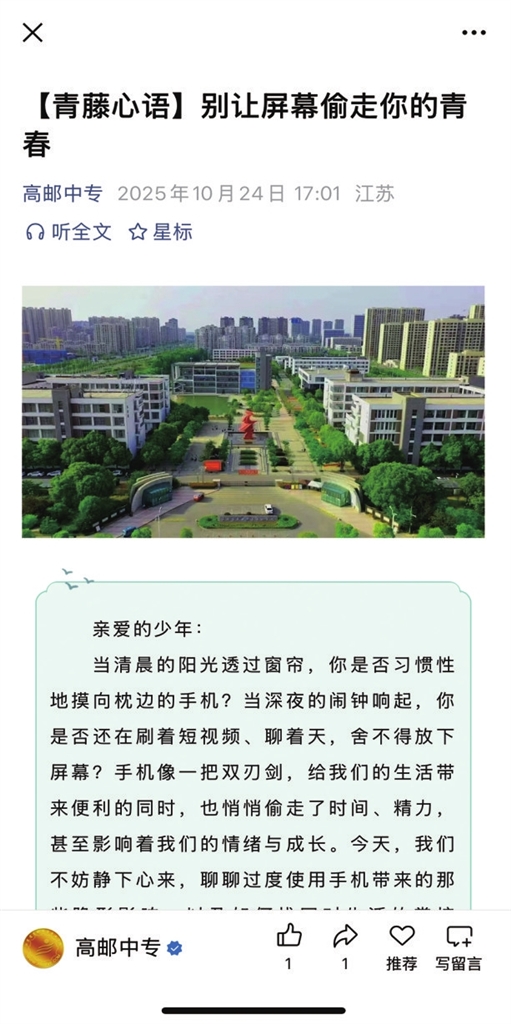 “青藤心语”专栏系列化,构建成长赋能“资源库”。为更好地丰富心理育人内容,提升心理育人实效,长期以来,学校公众号、校报的“青藤心语”专栏会持续推出心理健康主题文章,以专业视角和温暖笔触回应学生成中的心理需求。《欢迎新同学!中职生涯的美丽篇章,由你书写》《别让屏幕偷走你的青春》等推文聚焦新生适应、手机使用等现实议题,从“问题视角”转向“资源视角”,为学生提供实用建议与正向引导,在学生中引起较好地反响。