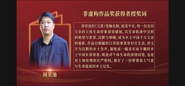 “一个作家能做的,或许只是流好自己的眼泪。”周荣池在《父恩》的序言中写下的这句话,恰是他乡土书写的初心。如今,第十届华语青年作家奖的荣誉加身,更让周荣池坚信,在娱乐化的时代浪潮中,乡土书写从未失去“催人泪下”的力量。他也始终怀揣对土地的敬畏、对人性的慈悲,用真诚的文字打捞乡土的记忆与情感,叩响读者的心灵之弦。